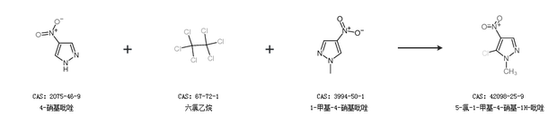 2.通过4-硝基吡唑、六氯乙烷和1-甲基-4-硝基吡唑合成5-氯-1-甲基-4-硝基-1H-吡唑