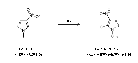 1.通过1-甲基-4-硝基吡唑合成5-氯-1-甲基-4-硝基-1H-吡唑,收率约20%;
