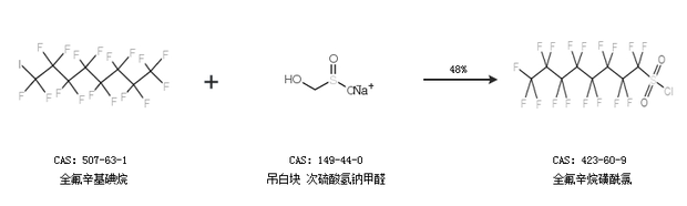 1.通过全氟辛基碘烷和吊白块 次硫酸氢钠甲醛合成全氟辛烷磺酰氯,收率约48%;