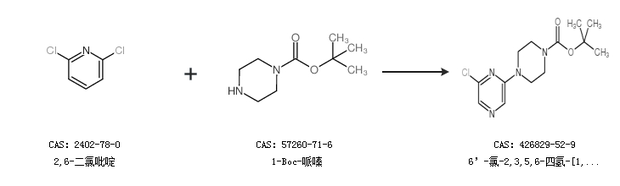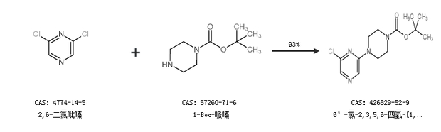 1.通过2,6-二氯吡嗪和1-Boc-哌嗪合成6’-氯-2,3,5,6-四氢-[1,2’]联吡啶-4-羧酸叔丁酯,收率约93%;