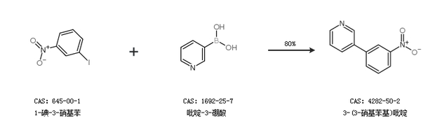 2.通过1-碘-3-硝基苯和吡啶-3-硼酸合成3-(3-硝基苯基)吡啶,收率约80%;