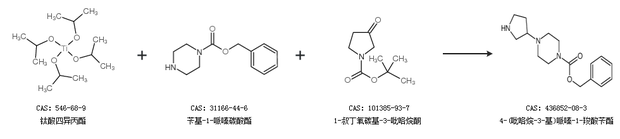 2.通过钛酸四异丙酯、苄基-1-哌嗪碳酸酯和1-叔丁氧碳基-3-吡咯烷酮合成4-(吡咯烷-3-基)哌嗪-1-羧酸苄酯