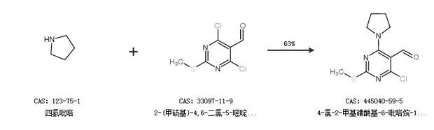 1.通过四氢吡咯和2-(甲硫基)-4,6-二氯-5-嘧啶甲醛合成4-氯-2-甲基磺酰基-6-吡咯烷-1-基-嘧啶-5-甲醛,收率约63%;