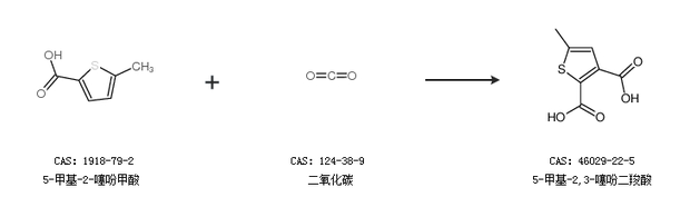 1.通过5-甲基-2-噻吩甲酸和二氧化碳合成5-甲基-2,3-噻吩二羧酸