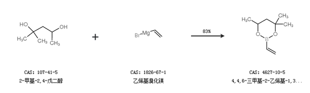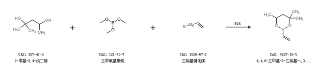2.通过2-甲基-2,4-戊二醇、三甲氧基硼烷和乙烯基溴化镁合成4,4,6-三甲基-2-乙烯基-1,3,2-二氧杂硼烷,收率约81%;