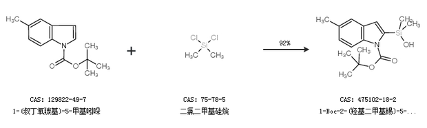 1.通过1-(叔丁氧羰基)-5-甲基吲哚和二氯二甲基硅烷合成1-Boc-2-(羟基二甲基锡)-5-甲基吲哚,收率约92%;