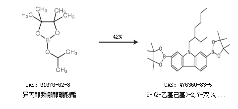 1.通过异丙醇频哪醇硼酸酯合成9-(2-乙基己基)-2,7-双(4,4,5,5-四甲基-1,3,2-二噁硼烷-2-基)-9h-咔唑,收率约42%;