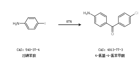2.通过对碘苯胺合成4-氨基-4-氯苯甲酮,收率约87%;