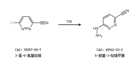 1.通过3-氯-6-氰基哒嗪合成6-肼基-3-哒嗪甲腈,收率约73%;