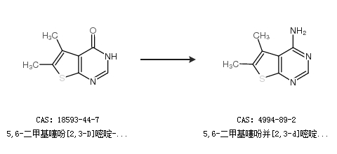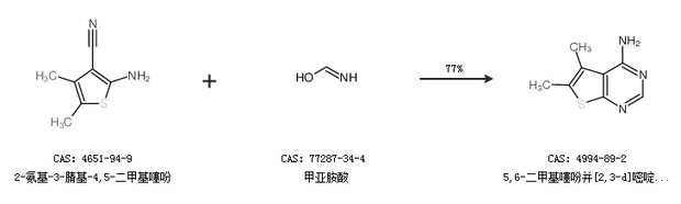 1.通过2-氨基-3-腈基-4,5-二甲基噻吩和甲亚胺酸合成5,6-二甲基噻吩并[2,3-d]嘧啶-4-胺,收率约77%;