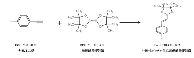 1.通过4-氟苯乙炔和联硼酸频那醇酯合成4-氟-反-beta-苯乙烯硼酸频哪醇酯,收率约75%;