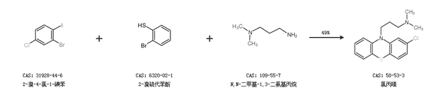 1.通过2-溴-4-氯-1-碘苯、2-溴硫代苯酚和N,N-二甲基-1,3-二氨基丙烷合成氯丙嗪,收率约49%;