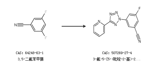 2.通过3,5-二氟苯甲腈合成3-氟-5-[5-(吡啶-2-基)-2H-四唑-2-基]苯甲腈