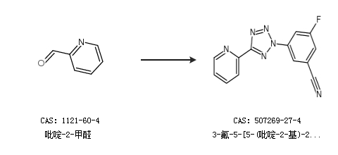 1.通过吡啶-2-甲醛合成3-氟-5-[5-(吡啶-2-基)-2H-四唑-2-基]苯甲腈