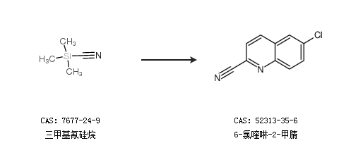 1.通过三甲基氰硅烷合成6-氯喹啉-2-甲腈,收率约57%;