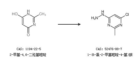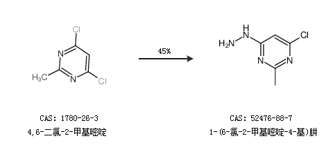 1.通过4,6-二氯-2-甲基嘧啶合成1-(6-氯-2-甲基嘧啶-4-基)肼,收率约45%;