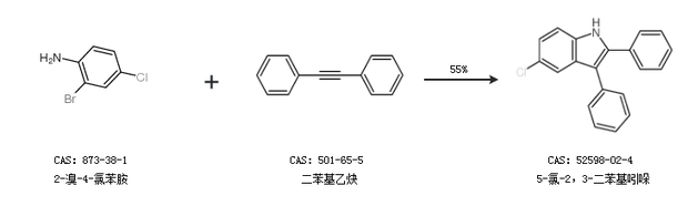 1.通过2-溴-4-氯苯胺和二苯基乙炔合成5-氯-2,3-二苯基吲哚,收率约55%;