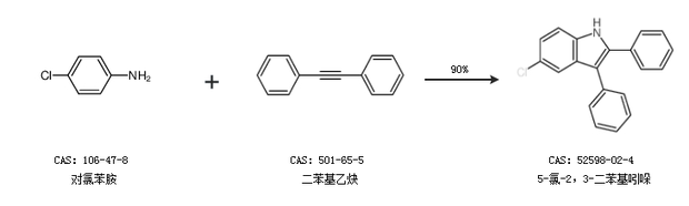 2.通过对氯苯胺和二苯基乙炔合成5-氯-2,3-二苯基吲哚,收率约90%;