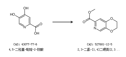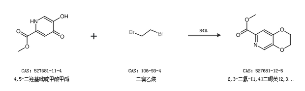 1.通过4,5-二羟基吡啶甲酸甲酯和二溴乙烷合成2,3-二氢-[1,4]二噁英[2,3-c]吡啶-7-羧酸甲酯,收率约84%;
