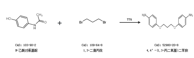 1.通过N-乙酰对氨基酚和1,3-二溴丙烷合成4,4’-(1,3-丙二氧基)二苯胺,收率约77%;