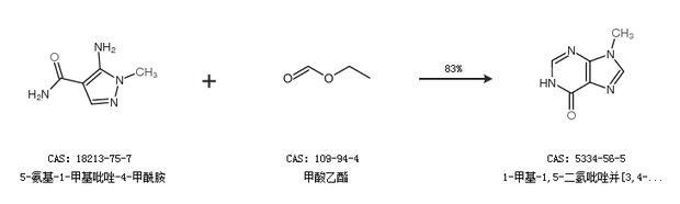 1.通过5-氨基-1-甲基吡唑-4-甲酰胺和甲酸乙酯合成1-甲基-1,5-二氢吡唑并[3,4-D]嘧啶-4-酮,收率约83%;