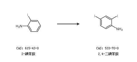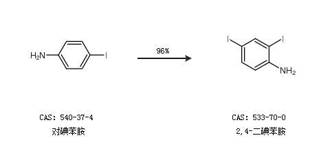 1.通过对碘苯胺合成2,4-二碘苯胺,收率约96%;