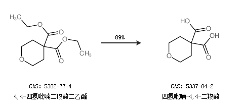 1.通过4,4-四氢吡喃二羧酸二乙酯合成四氢吡喃-4,4-二羧酸,收率约89%;