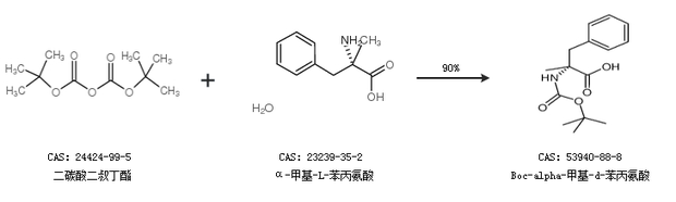 1.通过二碳酸二叔丁酯和α-甲基-L-苯丙氨酸合成Boc-alpha-甲基-d-苯丙氨酸,收率约90%;