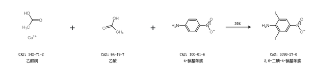 2.通过乙酸铜、乙酸和4-硝基苯胺合成2,6-二碘-4-硝基苯胺,收率约39%;