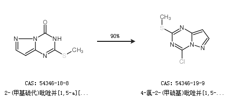 1.通过2-(甲基硫代)吡唑并[1,5-a][1,3,5]噻嗪-4(3H)-酮合成4-氯-2-(甲硫基)吡唑并[1,5-a][1,3,5]三嗪,收率约90%;