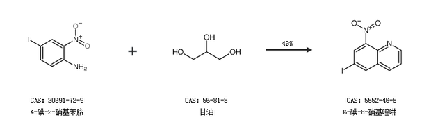1.通过4-碘-2-硝基苯胺和甘油合成6-碘-8-硝基喹啉,收率约49%;