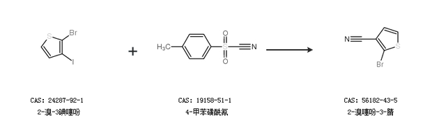 1.通过2-溴-3碘噻吩和4-甲苯磺酰氰合成2-溴噻吩-3-腈