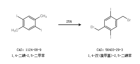 2.通过1,4-二碘-2,5-二甲苯合成1,4-双(溴甲基)-2,5-二碘苯,收率约25%;