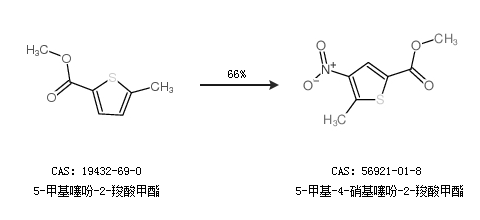 2.通过5-甲基噻吩-2-羧酸甲酯合成5-甲基-4-硝基噻吩-2-羧酸甲酯,收率约66%;