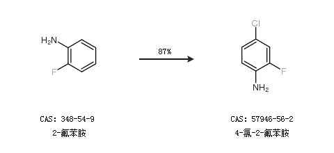 2.通过2-氟苯胺合成4-氯-2-氟苯胺,收率约87%;