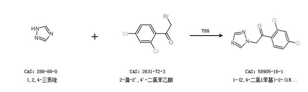 英文别名 2-(1H-1,2,4-triazol-1-yl)-2'',4''-dichloroacetophenone;1-(2,4-dichlorophenyl)-2-(1,2,4-1H-triazol-1-yl)ethanone;2'',4''-dichloro-2-(1H-1,2,4-triazol-1-yl)acetophenone;2-(1,2,4-triazol-1-yl)-2'',4''-dichloroacetophenone;1-(2,4-dichlorophenyl)-2-(1H-1,2,4-triazol-1-yl)ethanone;2'',4''-Dichloro-2-(1,2,4 triazol-1yl) acetophenone;2,4-dichlorophenyl (1H-1,2,4-triazol-1-ylmethyl) ketone;