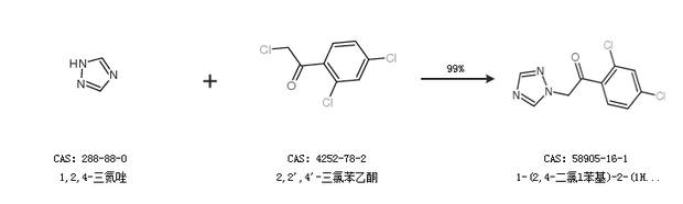 1.通过1,2,4-三氮唑和2,2'',4''-三氯苯乙酮合成1-(2,4-二氯l苯基)-2-(1H-1,2,4-噻唑-1-基)-乙酮,收率约99%;