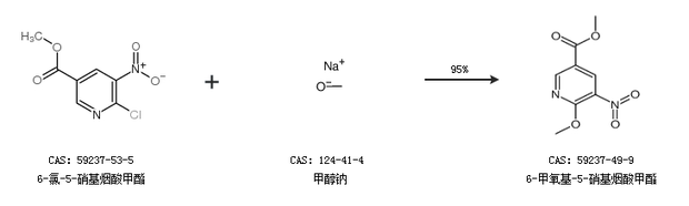 1.通过6-氯-5-硝基烟酸甲酯和甲醇钠合成6-甲氧基-5-硝基烟酸甲酯,收率约95%;