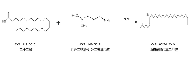 1.通过二十二酸和N,N-二甲基-1,3-二氨基丙烷合成山嵛酰胺丙基二甲胺,收率约95%;
