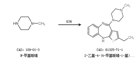 1.通过N-甲基哌嗪合成2-乙基-4-(4-甲基哌嗪-1-基)-10h-苯并[b]噻吩并[2,3-e][1,4]二氮杂卓,收率约63%;