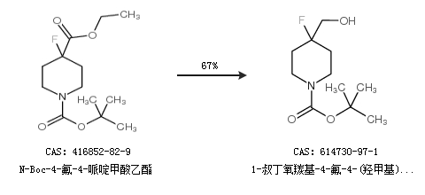 2.通过N-Boc-4-氟-4-哌啶甲酸乙酯合成1-叔丁氧羰基-4-氟-4-(羟甲基)哌啶,收率约67%;