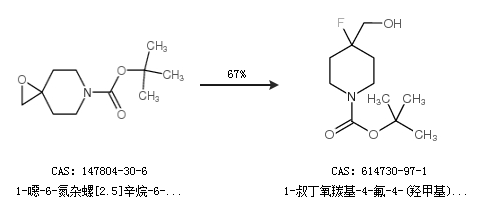 1.通过1-噁-6-氮杂螺[2.5]辛烷-6-羧酸-1,1-二甲基乙酯合成1-叔丁氧羰基-4-氟-4-(羟甲基)哌啶,收率约67%;
