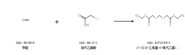 英文别名 3,5-Dithia-heptandisaeure-diaethylester;3,5-dithia-heptanedioic acid diethyl ester;Methylen-bis-(thioglykolsaeure-aethylester);Ethyl (([(2-ethoxy-2-oxoethyl)sulfanyl]methyl)sulfanyl)acetate;Formaldehydmercaptalessigsaeure-diaethylester;Methylenebis(ethyl thioglycolate);Methylen-bis-sulfidessigsaeurediethylester;Bis-aethoxycarbonylmethylmercapto-methan;
