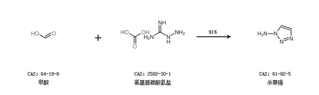 1.通过甲酸和氨基胍碳酸氢盐合成杀草强,收率约91%;