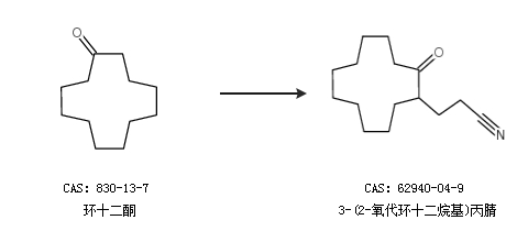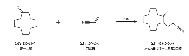 1.通过环十二酮和丙烯腈合成3-(2-氧代环十二烷基)丙腈,收率约84%;