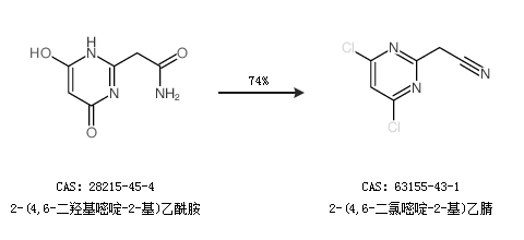 1.通过2-(4,6-二羟基嘧啶-2-基)乙酰胺合成2-(4,6-二氯嘧啶-2-基)乙腈,收率约74%;
