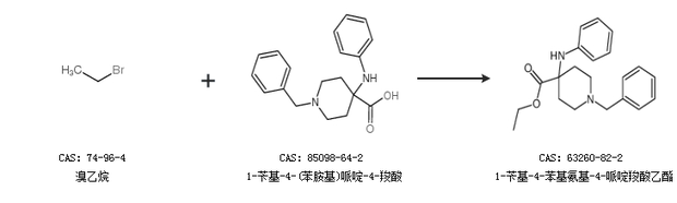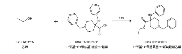 2.通过乙醇和1-苄基-4-(苯胺基)哌啶-4-羧酸合成1-苄基-4-苯基氨基-4-哌啶羧酸乙酯,收率约77%;