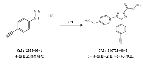 1.通过4-氰基苯肼盐酸盐合成1-(4-氰基-苯基)-5-(4-甲基磺酰基-苯基)-1H-吡唑-3-羧酸甲酯,收率约73%;