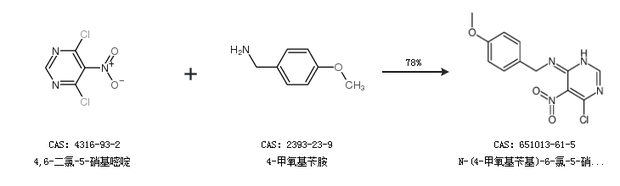1.通过4,6-二氯-5-硝基嘧啶和4-甲氧基苄胺合成N-(4-甲氧基苄基)-6-氯-5-硝基嘧啶-4-胺,收率约78%;