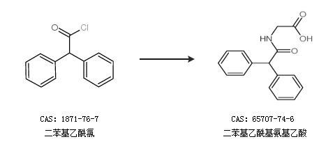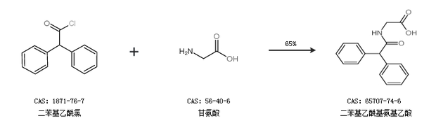 2.通过二苯基乙酰氯和甘氨酸合成二苯基乙酰基氨基乙酸,收率约65%;